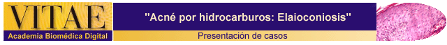 A los tres pacientes se les solicitó exámenes paraclínicos (hematología completa, pruebas de funcionalismo hepático y renal) que resultaron normales. Se les realizó biopsia de las lesiones que reportó comedones rotos e infectados en el paciente dos (2). Se indicó en todos los casos omitir el contacto con el aceite. Se les recetó Doxiciclina a 50 mg/día V.O, además tratamiento tópico con queratolítico (solución de Vleminckx) y peróxido de benzoilo al 5% en gel, durante 12 semanas con evolución satisfactoria.