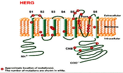 Mutación del gen HERG (LQT2) en el cromosoma 7q35-36 .. HERG (LQT2) codifica al canal Ikr de potasio , produciendo su mutación una pérdida de la función del canal . Un aumento de la concentración plasmática de potasio puede originar aumento en la salida de potasio y acortar efectivamente el QT en pacientes con esta mutación
