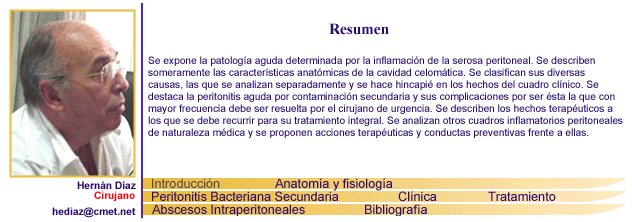 Se define la peritonitis como la inflamación de causa generalmente bacteriana, de la cavidad peritoneal. Para el cirujano, la forma clínica más relevante de peritonitis es la peritonitis secundaria de origen bacteriano, esto es, inflamación peritoneal causada por pérdida de la integridad del tracto gastrointestinal con la consiguiente extravasación de contenidos hacia la cavidad abdominal. El grado de contaminación bacteriana depende de varios factores, incluyendo el lugar de la rotura del intestino, la patología intestinal subyacente y de la habilidad de los mecanismos locales de defensa, por parte del huésped, para localizar la infección. Todas estas consideraciones pueden afectar las decisiones en vista a un óptimo manejo de los pacientes con peritonitis bacteriana. Todos los pacientes con peritonitis manifiestan algún grado de hipovolemia, como consecuencia de la acentuada secuestración de fluidos en la cavidad peritoneal inflamada y dentro del lúmen intestinal. La magnitud de la pérdida de líquidos y la condición general del paciente dictan las apropiadas medidas iniciales de resuscitación y monitoreo.