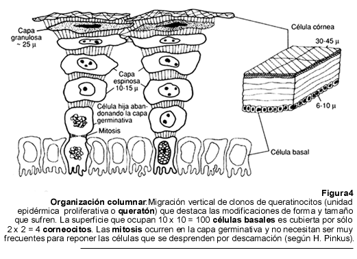 La queratinización comienza en la capa basal de la epidermis y, a partir de ahí, se multiplica en su ascenso hacia la capa córnea, formando queratinocitos y por ende, las diversas capas del epitelio (estratificado), en su trayecto la queratinización realiza una suerte de muerte programada de la célula epidérmica con la finalidad de formar queratinas (3).