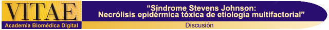 Discusión Se estudió el Síndrome de Stevens Johnson y la Necrólisis Epidérmica Tóxica, dos raras pero severas formas de enfermedades ampollosas mucocutáneas, que comparten características clínicas e histopatológicas similares pero difieren en la extensión del compromiso dérmico. Son reacciones que se piensan están mediadas por procesos inmunológicos9,13,24 y cuya etiología está estrechamente relacionada con el uso de algunas drogas y la exposición a ciertas infecciones 8,9,10,11,12 . Describimos un caso clínico de SSJ/NET en una escolar de 9 años con múltiples posibles factores etiológicos implicados descritos en la literatura, entre ellos el uso de fármacos8,9,10,25 como anticonvulsivos (Difenilhidantoina) 8,9,25 . Las fenitoinas y otras hidantoinas causan erupciones morbiliformes, eritema multiforme, SSJ y NET en relación a la dosis y el tiempo de tratamiento indicado. Se estima que un aproximado de 5% de pacientes en tratamiento con dichos fármacos presenta algún tipo de estas reacciones25 . La terapia prolongada con fenitoina en la paciente durante más de 14 días parece ser un factor influyente y determinante en la aparición de las reacciones dérmicas. Entre otros fármacos se asoció el uso de cefalosporinas y aminopenicilinas durante el tratamiento, implicados también en la aparición de la patología dérmica. La documentación del riesgo de las formas graves de erupciones asociadas a fármacos sigue siendo un reto importante. Basándose en registro de casos retrospectivos con éxito tomados de la población de SSJ y NET en diversos países y datos procedentes de organizaciones para el mantenimiento de la salud, se ha determinado que el riesgo de estas reacciones es de 1-10 x millón de personas al año. Además de los fármacos utilizados, la paciente presentaba un cuadro infeccioso de etiología viral cuyo agente causal era el Citomegalovirus, demostrado por PCR en suero. Este virus pertenece a la familia herpeviridae al igual que el virus del herpes simple, el cual ha sido descrito en múltiples bibliografías como un posible patógeno responsable de SSJ y NET 10,25,26 , por lo que consideramos esta entidad como una condición causal del SSJ y NET en este caso. Se inicia tratamiento con esteroides tipo metilprednisolona a dosis de 30 mg/kp/dia, ya que esta es la modalidad terapéutica más extensamente utilizada en nuestro país, asociada en algunos casos a un retraso en la recuperación e incluso a un incremento en el riesgo de la aparición del síndrome cuando son usados a elevadas dosis. Sin embargo, se evidenció una resolución satisfactoria del cuadro, con involución de las lesiones a los 14 días. Con una incidencia de 1 a 6 casos por millón al año y 0,4 a 1,2 casos por millón al año, el SSJ y la NET , respectivamente, constituyen dos patologías infrecuentes en la población. Además cabe destacar los múltiples factores etiológicos involucrados en estas entidades y en particular en este caso donde la combinación y el sinergismo de los mismos definen su complejidad.