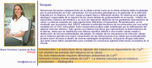Numerosas funciones celulares tanto en la célula normal como en la célula enferma están moduladas por la concentración de Ca2+ intracelular. En los procesos patológicos y en particular en la infección inducida por el rotavirus, el Ca2+ juega un papel clave a diferentes niveles. El rotavirus es el agente etiológico responsable de la mayoría de los casos fatales de gastroenteritis en el mundo. Infecta los enterocitos maduros del intestino y su ciclo de replicación depende de los gradientes intracelulares de calcio. La diarrea inducida por este agente tiene diferentes componentes. Recientemente, se ha mostrado que la proteína viral, NSP4, estimula la actividad secretora de los enterocitos por una señal mediada por el Ca2+ intracelular. Este componente pudiera estar amplificado por la estimulación del sistema nervioso entérico. Esto genera una diarrea secretora que representaría la fase temprana de la diarrea, antes que se establezca una diarrea osmótica debida a una muerte celular masiva y destrucción de las microvellosidades del epitelio. El estudio de los mecanismos de infección celular por el rotavirus permite una mejor comprensión de las interacciones virus-célula que eventualmente pudiera servir de base al diseño de nuevas estrategias terapéuticas, incluyendo drogas antivirales, que tanto hacen faltan actualmente para combatir los numerosos agentes infecciosos circulantes en el mundo.