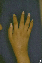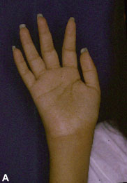 | Eritema y tumefacción en la cara palmar | Eritema y tumefacción en el dorso en la región del carpo |