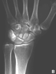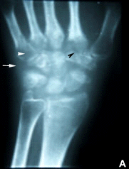 | Aumento de la densidad de partes blandas (flecha), osteopenia yuxta-articular (Cabeza de flecha blanca), erosiones en los primeros metacarpianos y huesos del carpo (cabeza de flecha negra). | Estudio normal |