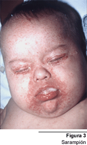 La infección se presenta con un período prodrómico de dos a tres días de fiebre, malestar general, tos, coriza y conjuntivitis. La fiebre inicialmente asciende con rapidez y se mantiene elevada hasta el final del período prodrómico, para elevarse de nuevo con el inicio del exantema, llegando hasta 39-40oC. (Fig.3)