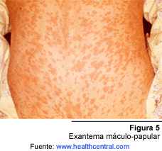 La erupción es máculo-papular de color rojo-violáceo, que comienza por detrás de las orejas y en la cara y posteriormente se extiende al tronco y extremidades, respetando usualmente las palmas de las manos y las plantas de los pies, adquiriendo su máxima expresión a los dos a tres días, con una duración de hasta siete días, desapareciendo en el mismo orden en que brotó, seguido de una descamación fina (furfurácea) que algunas veces puede ser severa, especialmente en niños desnutridos (1,6). (Fig. 5)