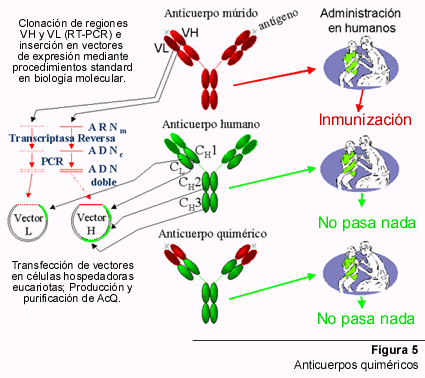 Un anticuerpo quimérico (AcQ) es una molécula artificial en la cual, las porciones constantes de las cadenas pesada y liviana provienen de una Ig humana y las regiones variables VH y VL son obtenidas de un AcMo múrido (Figura 5). El objetivo perseguido con la construcción de un AcQ es reducir la inmunogenicidad para el humano de los AcMo de ratón o rata, pero sin afectar la especificidad del Ac. Es conocido que las porciones más inmunogénicas de la molécula de Ig están asociadas a la porción constante de la molécula, en particular a la región Fc (115). Al reemplazar estas regiones por las equivalentes de origen humano se busca que la molécula resultante sea menos "extraña" para los seres humanos y así facilitar su uso in vivo para la profilaxis y tratamiento de enfermedades humanas (Figura 5). Adicionalmente, ya que la fisiología, catabolismo y las funciones efectoras de un Ac están asociadas al fragmento Fc, los AcQ debieran comportarse en forma óptima al ser administrados en humanos.