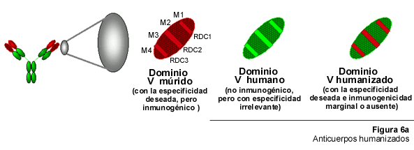 Un paso adelante en los esfuerzos para reducir la inmunogenicidad de los AcMo múridos, lo constituyó la creación de los Ac humanizados (AcH). La tecnología para la producción de AcH fue desarrollada en el laboratorio de G. Winter en Inglaterra poco después de la invención de los AcQ (52) y, en la actualidad, engloba un conjunto de procedimientos (47) tales como "CDR grafting" (transplante de CDR), "Ab reshaping" (106) y "Ab resurfacing/veneering" (81). El argumento que la soporta se basa en el supuesto de que el sitio de combinación al antígeno, el paratopo, se forma a partir de la combinación espacial de las asas hipervariables que corresponden a las RDC, mientras que las regiones M sólo funcionan como un andamio cuya única función es servir de soporte estructural al paratopo. Asumiendo esto como cierto en la elaboración de un AcH, las RDC de un anticuerpo múrido son transplantados en el contexto de regiones M humanas (Figura 6A), formándose así una región V híbrida ratón-humano y confiriéndole la especificidad deseada a una molécula que en el resto de su estructura es completamente humana. La ventaja de esto es que los epitopos asociados a las regiones M múridas, los cuales están presentes en los AcQ, no se encuentran en los AcH.