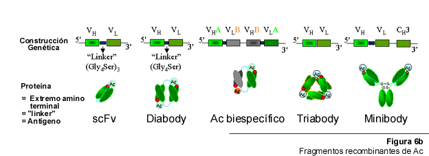Una estrategia más efectiva, basada en técnicas de ADN recombinante, ha sido desarrollada recientemente. Esta estrategia se basa en la construcción scFv descrita en una sección anterior, sólo que la longitud del "linker" es menor en comparación la del scFv original. Esta reducción del "linker" (a tan solo 5 aminoácidos) imposibilita la formación de un Fv funcional entre dos dominios VH y VL en una misma molécula. Ello conduce a la interacción de dos moléculas de scFv , formándose un dímero, el cual posee dos sitios de combinación con el antígeno (Figura 6B). Si la especificidad de los dominios VH y VL es la misma, el producto obtenido es un homodímero bivalente conocido como "diabody" (42) (la traducción máó apropiada de "diabody" pudiera ser "fragmento bivalente").