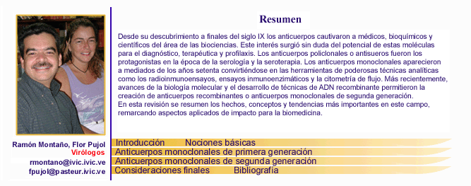 Desde su descubrimiento, hacia finales del siglo pasado, los anticuerpos han cautivado la atención de médicos, bioquímicos y científicos en el área de las biociencias y la historia recoge testimonios de ello. Por ejemplo, el primer premio Nobel, otorgado en el área de Fisiología o Medicina, lo recibió Emil von Behring, precisamente, gracias al trabajo en el cual reportó el descubrimiento de los anticuerpos (4). Desde entonces y hasta el presente, quince premios Nobel han sido otorgados a individuos que han hecho aportes significativos en el ámbito de la inmunología. Siete de éstos fueron entregados a personas cuyo trabajo estuvo directamente relacionado con anticuerpos (1W). Sin duda, este interés surgió de la inmensa potencialidad que, desde un inicio, les fue reconocida a estas moléculas para ser usadas en aplicaciones diagnósticas y terapéutico-profilácticas. Los anticuerpos policlonales, o antisueros, fueron los protagonistas en la época de la serología y la seroterapia. Los anticuerpos monoclonales, de primera generación, aparecieron a mediados de los años setenta para convertirse en las herramientas principales de poderosas técnicas analíticas como los radioinmunoensayos, los ensayos inmunoenzimáticos y la citometría de flujo. Más recientemente, avances importantes en el área de la biología molecular y el desarrollo de técnicas de ADN recombinante han hecho posible la creación de anticuerpos recombinantes, también llamados anticuerpos monoclonales de segunda generación. En esta revisión intentaremos resumir los hechos, conceptos y tendencias más importantes en este campo, remarcando los aspectos aplicados de mayor impacto para la biomedicina.