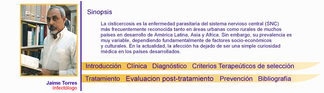 porcino, al ingerir huevos infectantes del parásito.Contrario a una creencia común, la ingestión de carne de cochino cruda o poco cocida no expone al individuo directamente al riesgo de cisticercosis, sino al de teniasis intestinal, por otra parte, la ingestión de huevos de T. solium, provenientes de contaminación fecal humana, transmite la cisticercosis entre los hospederos intermediarios porcinos o el ser humano. Ocasionalmente, la cisticercosis puede ser el resultado de un proceso de auto-infección, a través de la contaminación directa ano-boca, en un individuo portador de teniasis intestinal. La cisticercosis es la enfermedad parasitaria del sistema nervioso central (SNC) más frecuentemente reconocida tanto en áreas urbanas como rurales de muchos países en desarrollo de América Latina, Asia y Africa, en los cuales su prevalencia es muy variable, dependiendo fundamentalmente de factores socio-económicos y culturales. En la actualidad, la afección ha dejado de ser una simple curiosidad médica en los países desarrollados. Un flujo cada vez más creciente de inmigrantes provenientes de áreas endémicas hacia los países desarrollados, ha resultado en una prevalencia más alta de la infección y también en el reconocimiento de casos clínicos, que pueden ocurrir aisladamente o bajo la forma de brotes. En las áreas endémicas la enfermedad comúnmente afecta a comunidades con patrones higiénicos bajos, aunque puede también encontrarse en forma ocasional entre las clases medias y altas urbanas. Los brotes de casos adquiridos en los países desarrollados sin embargo, han atribuido usualmente a contactos con empleados domésticos inmigrantes, o a la exposición a miembros de la familia que han retornado de visitas a zonas endémicas 1. |