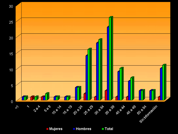 El grupo etario más afectado está entre 20 y 34 años de edad: 58.5% población masculina y 54.6% femenina. También es importante la incidencia entre los 35 y 44 años en los dos sexos, así como el grupo de 15 a 19 años en los varones. No se conoce la edad en el 10,5% de los casos.