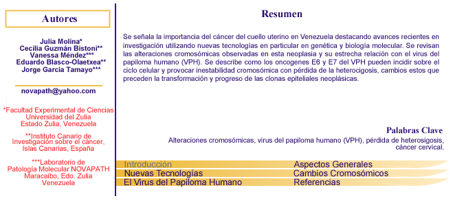 Estudios epidemiológicos realizados en Brasil, Colombia, México, Perú y Costa Rica, entre otros países, ratifican la importancia del cáncer del cuello uterino en Latinoamérica ( 1,2 ). En Venezuela, desde la década de los años cuarenta, el cáncer del cuello uterino es la primera causa de muerte por cáncer en la mujer. A pesar de algunas variaciones en la tendencia de la tasa de mortalidad que parecían haber mostrado un descenso en los 25 años anteriores a 1985, es preocupante el posterior repunte que se mantiene desde entonces y, el cáncer del cuello uterino, sigue siendo la primera causa de muerte por cáncer en la mujer venezolana. El cáncer cervical (CC) es responsable aproximadamente del 20% del total de las muertes por cáncer en Venezuela; los Estados Trujillo, Guárico, Yaracuy, Zulia, Lara, Aragua, Mérida, Táchira, Bolívar y Falcón son las entidades federales más afectadas por esta patología, con tasas de mortalidad superiores al promedio nacional. A pesar de que fue en Venezuela donde se describió inicialmente la presencia del virus del papiloma humano (VPH) en el cáncer cervical y algunos trabajos se publicaron en los años 70 y 80 ( 3,4 ), llama la atención el hecho de que las investigaciones sobre esta neoplasia en nuestro país son prácticamente inexistentes. En este artículo, hemos querido actualizar algunos importantes conceptos relacionados con las alteraciones cromosómicas del epitelio cervical y la relación de las mismas con la infección por el VPH y la transformación neoplásica.