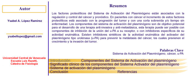 The proteolytic factors of the System of Activation of the Plasminogen are associate with the regulation and control of the cancer and prognosis. In patients with cancer the increase of these proteolytic factors is associate with the progression of the tumor. The components of the system of activation of the plasmingen are of potential objective for the development of an anti-invasive therapy and anti-metastatic, this therapy can be possible with components of inhibition of the union of u-PA to its receptor, or with specific inhibitors of its enzymatic activity. They exist inhibiting synthetic of the enzymatic activity of urokinase-type plasminogen activator (u-PA) to prevent the metastasis with the cancer, which prevents the growth and the invasion of the tumor. Keywords Periodo revisado (1988 – 2005). Introducción Los