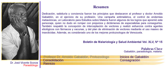 Profesor Dr. Arnoldo Gabaldon, Protozoólogo Por iniciativa de los doctores Enrique Meléndez y Rafael Bonfante, de la Facultad de Medicina de la Universidad Francisco de Miranda, con la participaciónde la Dra. Mariela Montalve de Mendoza, Decana de la Facultad, el 14 de Abril próximo pasado, fue develado en el jardín anexo al Departamento de Parasitología, un busto del Dr. Arnoldo Gabaldon. Comprometido para hacer el discurso de orden en esa ocasión, intenté un bosquejo sobre el carácter paradigmático de su figuración en la campaña nacional antimalárica y el control de endemias metaxénicas. Rompiendo con prejuicios y dictados por cenáculos de expertos, el Dr. Gabaldon dio solidez a la novedosa concepción de interceptación de vectores, demostrando en la práctica una tercera vía de control realizable, además de esfuerzos que se hacen contra los agentes etiológicos con fármacos y vacunas, y del fallido programa de exterminio de sus vectores mediante el uso masivo de insecticidas. La concepción y ejecución del programa interceptativo no fue producto casual, sino un resultado del convencimiento de una mentalidad extraordinaria preparada, para esos avatares sanitarios en un país con extrema carencia de recursos. Gabaldon es el ejercicio supremo de la individualidad. En esta oportunidad haremos un recuento de su formación a través de nuestro contacto con tan extraordinaria personalidad científica. |