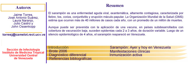 El sarampión es una enfermedad aguda viral, exantemática, altamente contagiosa, producida por un virus RNA, miembro del género morbilivirus de la familia paramixovirus. Se transmite principalmente por medio de gotitas de saliva suspendidas en el aire, que entran en contacto con la mucosa del tracto respiratorio superior o conjuntiva. Los únicos reservorios naturales del virus son el hombre y los primates (1,2) . Es una enfermedad de distribución mundial. En países subdesarrollados con cobertura de vacunación baja, suceden epidemias cada dos a tres años, de duración variable dependiendo del tamaño de la población, las condiciones de hacinamiento y el estado de inmunidad, a diferencia de países con alta cobertura de vacunación donde la epidemia sucede en períodos de cada cinco a siete años, con pequeños números de casos. La Organización Mundial de la Salud (OMS) estima que ocurren más de 40 millones de casos cada año, con un promedio de un millón de muertes. La introducción de la vacuna de sarampión en las Américas en los años 60, ha determinado un marcado descenso en el número de casos reportados (1) . Venezuela, en el año 2002, presentó 2.382 casos secundarios después de un caso importado procedente de Europa. Esto llevó a tomar medidas de emergencia y se implantaron campañas de vacunación que nos mantuvieron en silencio epidemiológico por 4 años. El 23 de febrero de 2006 reaparece el virus en nuestro país debido a un nuevo caso introducido desde Europa, con la aparición de los subsiguientes casos secundarios. |