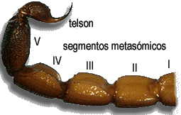 Región extrecha, cilíndrica, del opistosoma. Está formada por 5 segmentos más el telson, donde están ubicadas las glándulas del veneno. Comúnmente se conoce como cola.