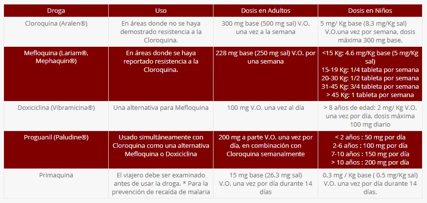 En aquellas regiones del país donde la especie predominante del parásito es P. vivax, la cloroquina, a la dosis de 2 tabletas (300 mg base) semanales en los adultos, es la droga habitualmente recomendada. El medicamento debe comenzarse una semana antes de viajar al área endémica y ser tomado durante toda la permanencia y al menos 4 semanas después de haber salido, preferiblemente en un día fijo de la semana y durante la noche (después de comer). A su vez, al regresar del área endémica la persona debe tomar 1 tableta diaria de primaquina, durante 14 días, con el fin de evitar la ocurrencia de recaídas tardías.